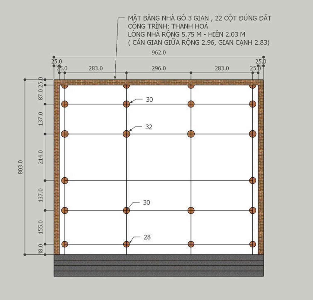 Nhà 3 gian 22 cột có cột đồng trụ